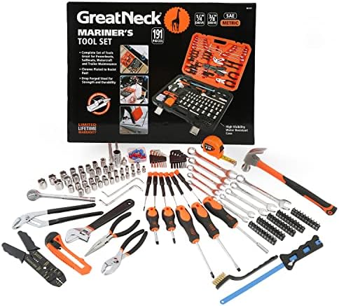 The GreatNeck MS191 Mariner’s Tool Set (191 Piece) is built for essential boat, trailer, and small engine maintenance. This compact marine tool kit includes SAE and metric drive sockets, combination wrenches, hex keys, and a spark plug socket—everything you need for on-the-water repairs. Rust-resistant chrome plating withstands harsh marine conditions, while drop-forged steel adds lasting strength. A floating, water-resistant case keeps tools dry, organized, and secure, even if dropped overboard. Whether you’re maintaining an outboard motor, tightening trailer bolts, or making quick electrical fixes, this boat tool kit delivers versatile support. Ideal for sailboats, powerboats, and watercraft storage, the GreatNeck marine tool kits fit easily in tight compartments and helps prevent downtime on the water. Includes pliers, screwdrivers, utility knife, electric terminals, magnetic bit driver, and more. Stay ready for routine maintenance and emergency repairs with this reliable, space-saving 191 piece boat and trailer small tool kit.