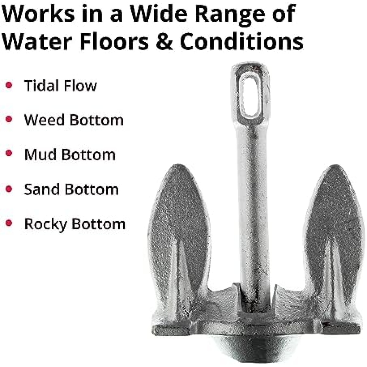 Durable & Works in a Variety of Waters: Designed for protected inland waters, the SeaSense River Anchor works effectively in strong currents and tidal waters, as well as sand, mud or weed bottoms; it’s made of one piece cast iron with black vinyl coating to help protect the gel coat
