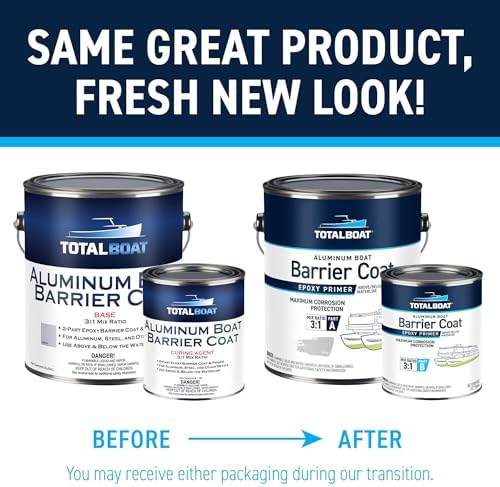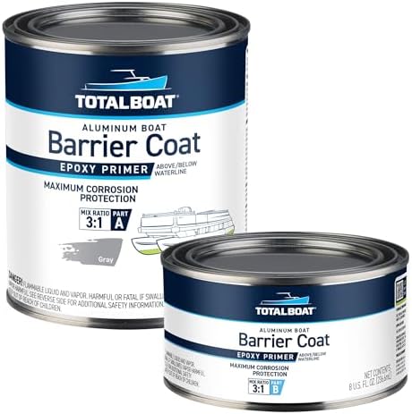 TotalBoat Aluminum Boat Barrier Coat two-part epoxy primer is the dependable way to prime aluminum in preparation for bottom paint or other 1- or 2-part paint finishes. It’s easy to use and adheres extremely well to properly prepared aluminum hulls and pontoons to create a waterproof tie-coat barrier that offers exceptional protection against corrosion. This effective high-build formula fills small surface imperfections and provides excellent adhesion so paint won’t peel and will last longer. In addition, you can apply it to all underwater metals for superior corrosion protection.Proper preparation is the key to success when priming or painting aluminum surfaces. We strongly recommend the use of our TotalBoat Aluminum Boat Etch Wash (sold separately) to clean, condition, and prepare the aluminum surface so it has enough tooth for the barrier coat primer to adhere to strongly and effectively. After rinsing it off thoroughly and drying the surface, apply Aluminum Boat Barrier Coat primer within 1 hour of metal preparation.Aluminum Boat Barrier Coat has a simple 3 to 1 mix ratio that’s easy to use, can be recoated with itself in as little as three hours at 90°F, and requires no sanding. After mixing thoroughly, allow an induction period of 15 minutes before reducing with TotalBoat Epoxy Primer Thinner 200, if needed, and applying by brush, roller, or spray equipment. Compare to Interlux Interprotect and Pettit Aluma Protect marine epoxy primers. Aluminum Boat Barrier Coat provides great protection at a better value for your money. All TotalBoat products are developed by boaters for boaters, to provide great value and great results. We know what works and what doesn’t. 100% made in the USA.